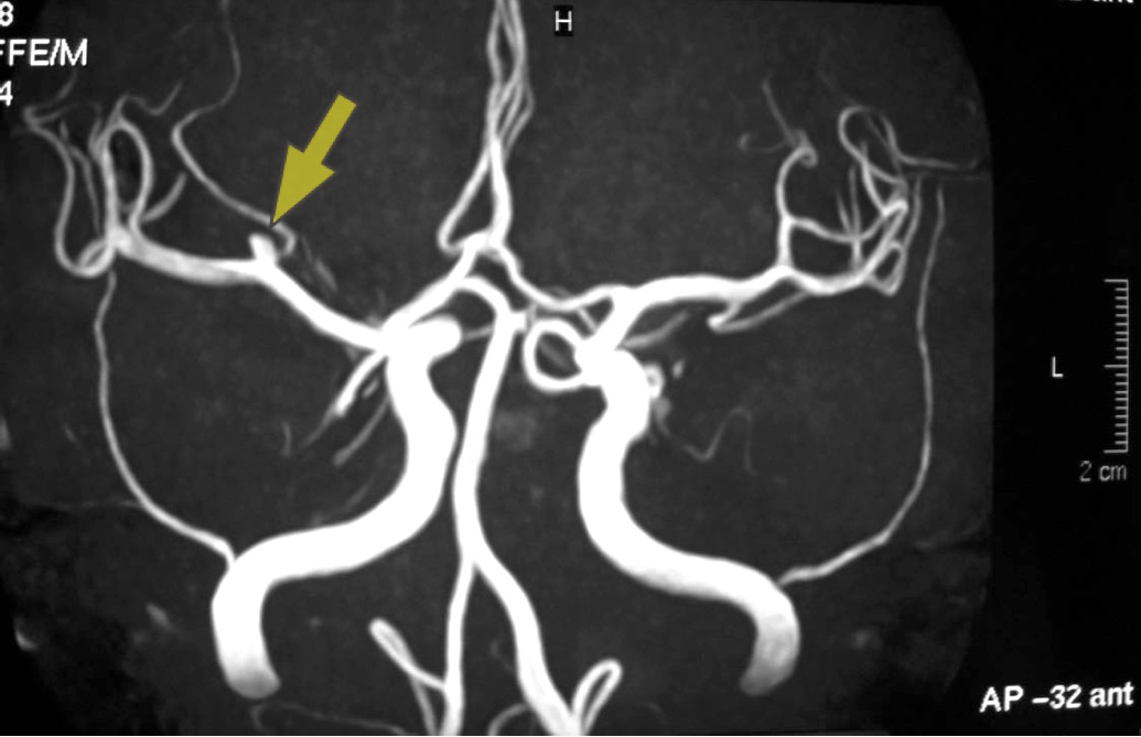 <未破裂右中大脳動脈瘤:約3mm MRA画像>